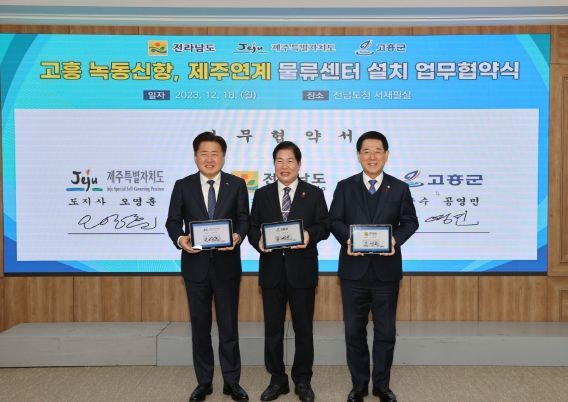[한국기자연대] 고흥군은 18일 전남도청 서재필실에서 전라남도, 제주특별자치도와 3자 간 녹동신항에 제주 생산품의 내륙 연계 물류거점 조성을 위한 업무협약을 체결했다.