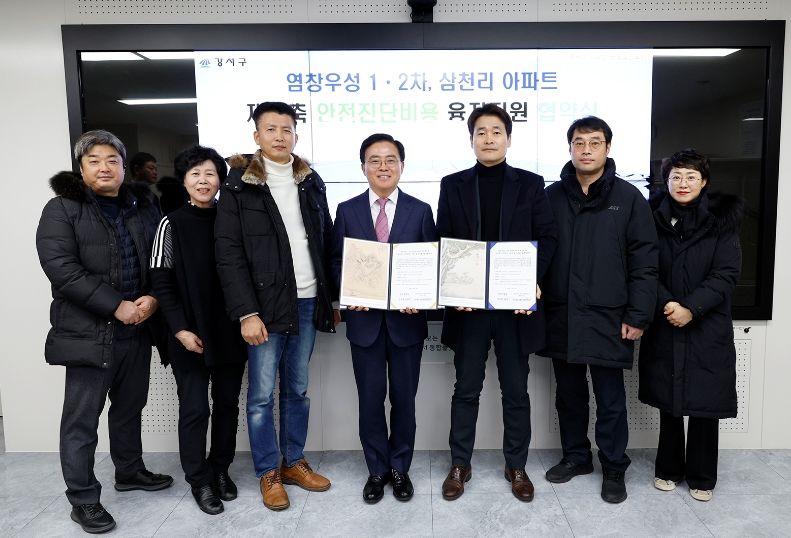 진교훈 강서구청장은 18일 오후 2시 구청장실에서 염창동 우성1·2차, 삼천리아파트 주민대표와 ‘재건축 안전진단 비용 융자지원을 위한 업무협약’을 체결했다.