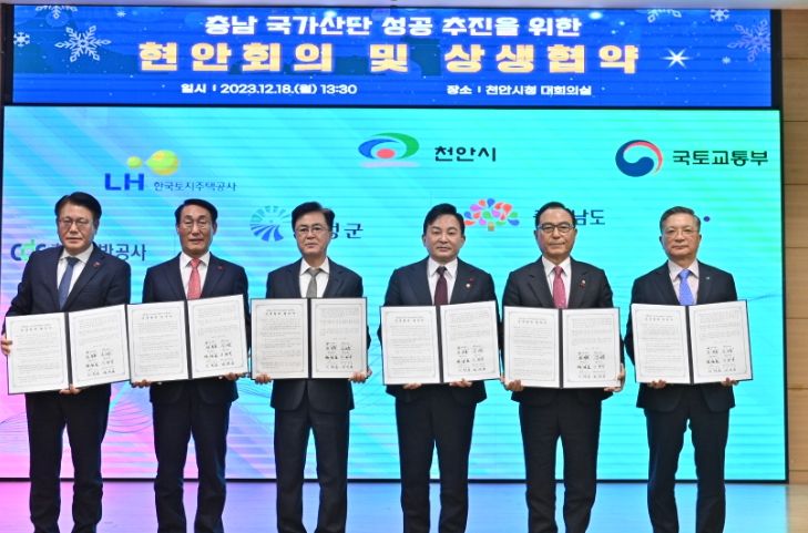 도는 18일 천안시청 대회의실에서 김태흠 지사와 원희룡 국토부 장관을 비롯해 박상돈 천안시장, 이용록 홍성군수, 이한준 한국토지주택공사(LH) 사장, 정석완 충남개발공사 사장 등이 참석한 가운데, 현안회의 및 상생협약식을 개최했다.