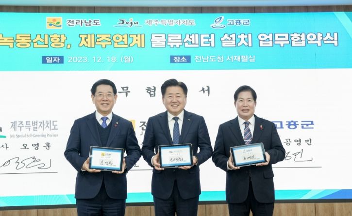 제주도와 전라남도, 고흥군은 18일 오전 11시 전라남도청 서재필실에서 지역의 물류산업 발전과 원활한 물류체계의 효율성을 높이기 위해 업무협약을 체결했다고 밝혔다.