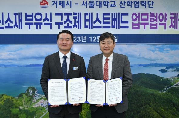 [한국기자연대] 거제시와 서울대학교 산학협력단은 18일 신소재 부유식 구조체 테스트베드 업무협약을 체결했다.