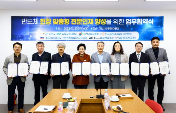 [한국기자연대] 이천시는 20일 두원공과대학교, 이천교육지원청, 한국세라믹기술원 이천분원, ㈜디에스테크노, ㈜밸류엔지니어링, 비씨엔씨㈜, 영진아이엔디㈜와 함께 반도체 현장 맞춤형 전문인재 양성을 위한 업무협약을 체결했다고 밝혔다.