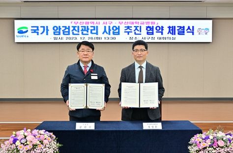 지난 12월 26일 서구청 대회의실에서 부산대학교병원(부산지역암센터)과 국가 암검진관리 사업의 활성화를 위한 업무협약을 체결했다. 이 자리에는 공한수 구청장, 정성운 부산대학교병원장 등이 참석했다.
