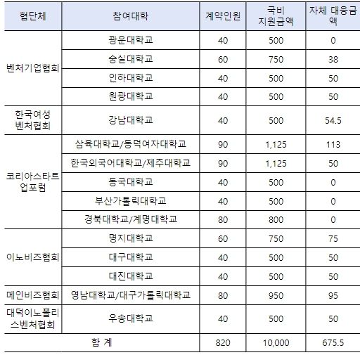 2024년에는 기존 19개 대학 외에 1개 대학 이상을 추가 선정하며, 희망 대학은 1월 17일까지 중소벤처기업부로 신청하면, 심사 후 20일까지 결과가 통보될 예정이다.