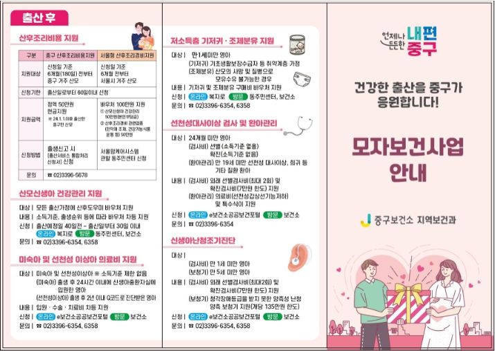 이 밖에도 중구는 △남녀 임신 준비 지원 △난임부부 시술비 및 한약 지원 △임산부 등록 및 건강 관리 △고위험 임신부 의료비지원 △영유아 가정방문지원 △산모신생아 건강관리서비스 등 다양한 임신 출산 지원사업을 펼치고 있다. 자세한 문의는 중구보건소 지역보건과 모자보건팀으로 하면 된다.