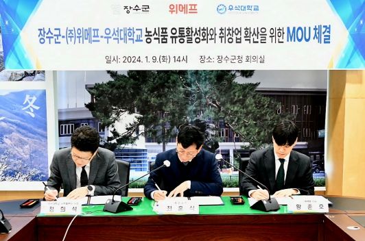 [한국기자연대] 장수군은 ㈜위메프, 우석대학교와 RIS 지역혁신 자율과제 공모사업의 성과 확장과 장수군 농식품 유통활성화 및 취창업 확산을 위한 업무협약을 9일 14시, 장수군청 회의실에서 진행했다고 밝혔다.