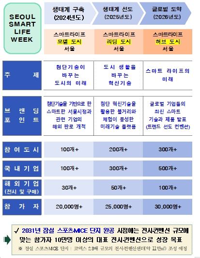 시는 CES가 단순 전자산업 신제품을 소개하는 전시회를 넘어 기업, 정부, 기관・단체 등 다양한 주체가 총출동한 글로벌 혁신 기술의 장으로 발전한 것처럼, ‘서울 스마트 라이프 위크’를 찾은 세계 도시정부 관계자 및 글로벌 기업에게 최신 기술・생활 흐름에 따른 매년 특화된 주제 전시를 선보이고자 이번 로드맵을 수립했다고 설명했다.