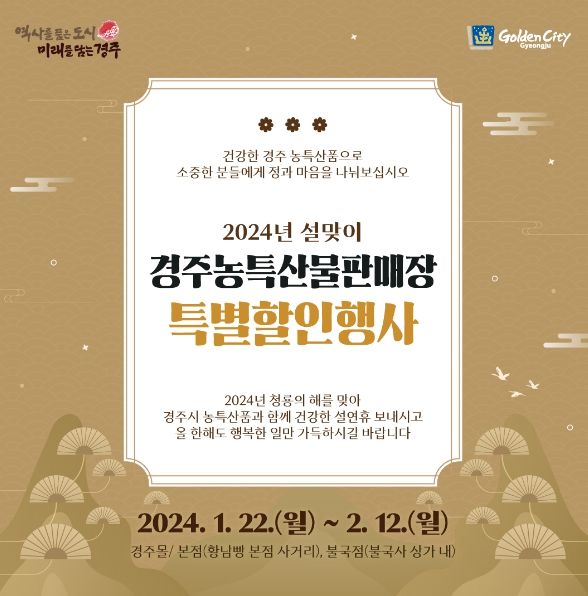 농특산물은 다음달 12일까지 온라인 경주몰에서 20% 할인, 오프라인 매장인 본점(계림로 69), 불국점(진현로1길 59-5)에서 10% 할인 혜택을 제공한다.