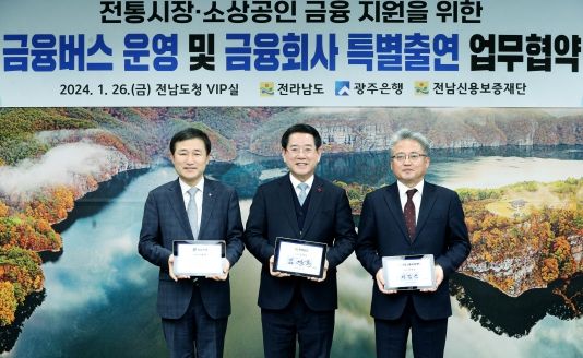 [한국기자연대] 전라남도는 26일 도청 접견실에서 전남신용보증재단, 광주은행과 함께 전통시장·소상공인 금융 지원을 위한 ‘금융버스 운영 및 금융회사 특별출연 업무협약’을 했다.