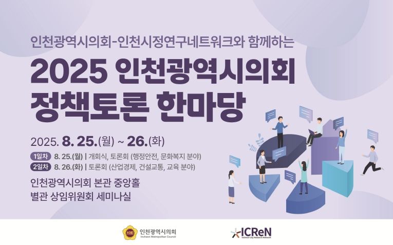 [한국기자연대] 인천광역시의회는 시민의 행복과 더 나은 지역사회 발전을 위해 참신하고 다양한 정책 발굴 및 제안의 장인 ‘2025 인천광역시의회 정책토론 한마당’을 오는 25일부터 26일까지 이틀 동안 개최한다.
