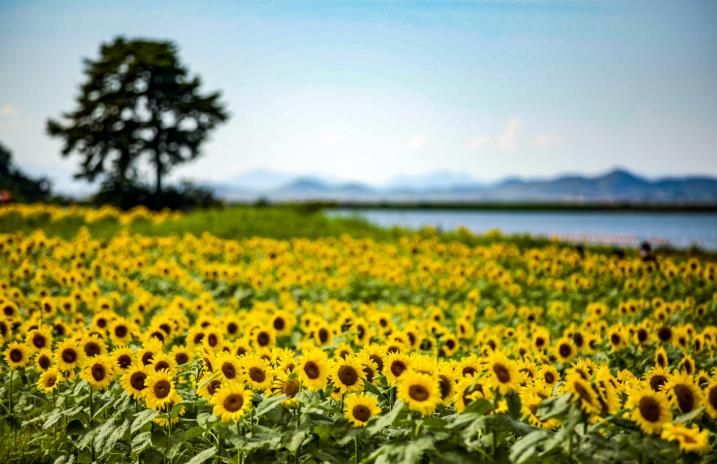 약 3만㎡ 규모의 공유수면에 해바라기가 황금빛 물결처럼 저수지를 따라 끝없이 펼쳐져 장관을 이룬다.