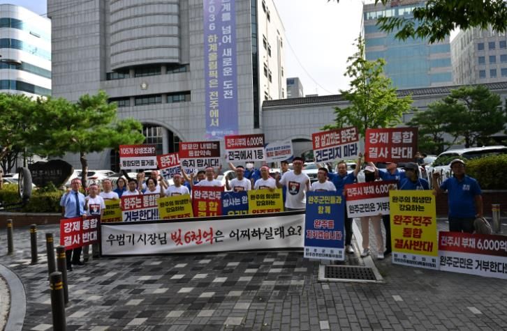 [한국기자연대] 완주군의회는 8월 20일 오전 전주시청 앞에서 ‘완주-전주 통합 반대 출근길 캠페인’을 열고 강력한 반대 입장을 밝혔다.