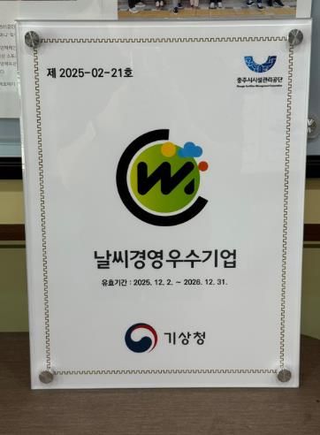 이번 인증은 기후변화로 인한 다양한 피해를 사전에 예방하고, 기상정보를 체계적으로 활용해 안전하고 효율적인 시설 운영을 실천한 결과라는 점에서 그 의미가 크다.