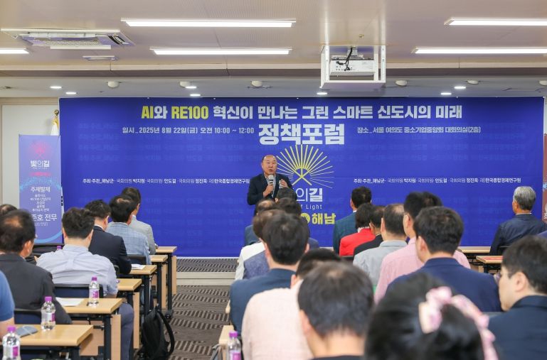 [한국기자연대] 해남군의회는 8월 22일, 서울 중소기업중앙회에서 열린 ‘솔라시도 AI 에너지 신도시 및 RE100 산업단지 조성 정책포럼’에 참석하여, 신재생에너지 중심의 미래 산업단지 조성과 에너지 신도시 개발을 위한 다양한 논의를 함께했다.