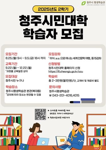 [한국기자연대] 청주시평생학습관은 오는 9월 5일까지 2025년 2학기 청주시민대학에 참여할 학습자를 모집한다.