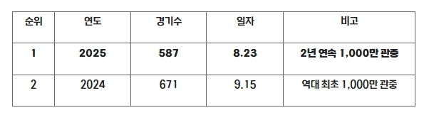 587경기만에 1,000만 관중을 달성하며, 역대 최초 1,000만 관중을 달성한 2024시즌 671경기만의 1,000만 관중 달성 기록을 84경기 단축했다.