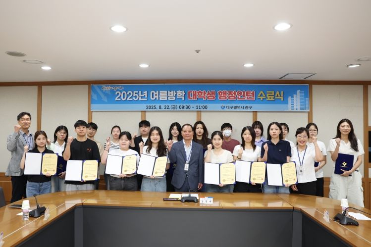 [한국기자연대] 대구 중구는 지난 22일 구청 3층 상황실에서 ‘2025년 여름방학 대학생 행정인턴 수료식’을 개최했다.