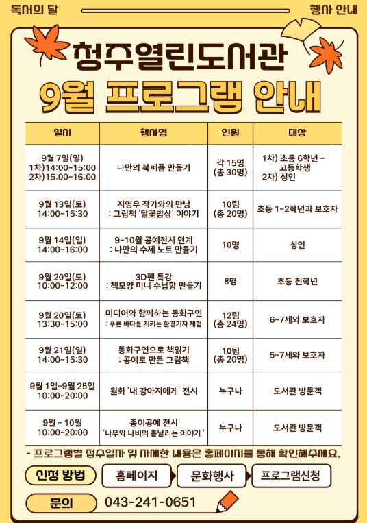 [한국기자연대] 청주시 청원구 내덕동 문화제조창에 위치한 청주열린도서관이 9월 독서의 달을 맞아 책을 사랑하는 시민들을 위해 다채로운 독서문화 프로그램을 운영한다.