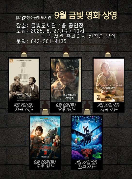 [한국기자연대] 청주금빛도서관은 9월 독서의 달을 맞아 ‘읽기 예보: 오늘 읽음, 내일 맑음’을 주제로 금빛 영화 상영을 운영한다.
