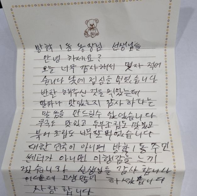 [한국기자연대] 서울 도봉구방학1동에 홀로 거주하고 있는 어르신 A씨(83)가 방학1동주민센터에 보낸 손 편지 내용이 지역사회에 잔잔한 감동을 주고 있다.