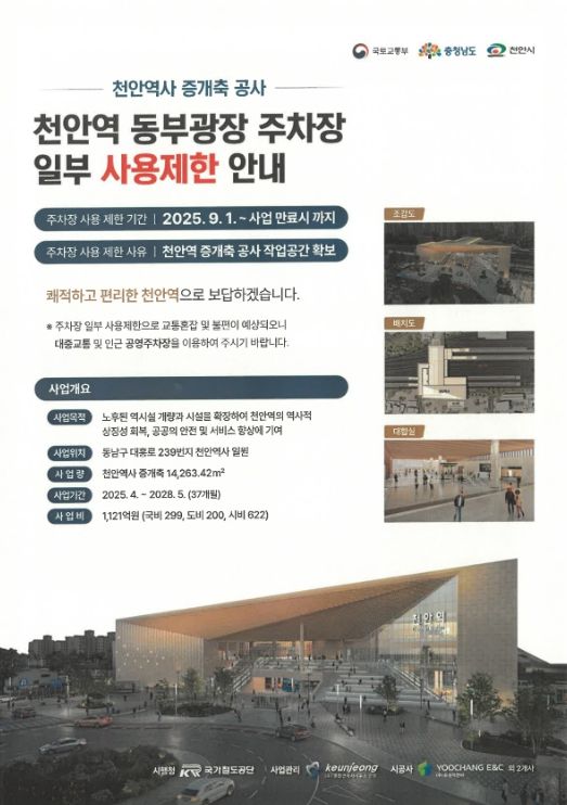 시는 천안역 증개축 공사 작업공간 확보를 위해 천안역 동부광장 주차장 100면 중 50면의 사용을 제한한다.