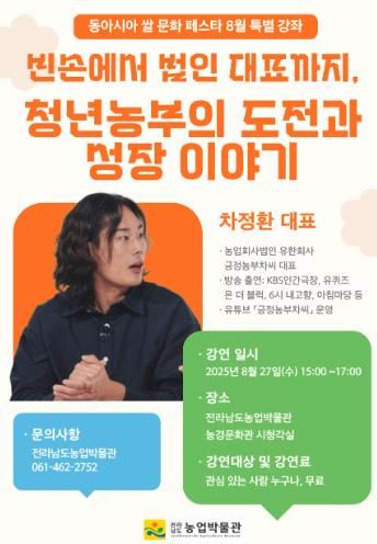 [한국기자연대] 전라남도농업박물관은 27일 오후 3시 ‘청년 농부의 도전과 성장 이야기’를 주제로 한 ‘동아시아 쌀 문화 페스타’ 두 번째 특별강좌를 연다.