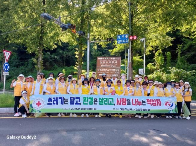 [한국기자연대] 대한적십자사 고성군협의회 회원들은 8월 23일, 전국노래자랑 및 공룡엑스포 행사장을 찾는 방문객에게 깨끗한 고성군 이미지 제고를 위해 회화면 배둔리 일원에서 쓰담걷기 캠페인을 진행했다.