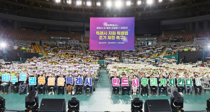 [한국기자연대] 창원특례시는 25일 창원스포츠파크 창원체육관에서 열린 2025 창원시 이·통장연합회 한마음 다짐대회에서 ‘시민 공감 릴레이 캠페인’의 첫 퍼포먼스를 진행하며, 비수도권 특례시 기준 변경과 '특례시 지원 특별법' 조기 제정을 촉구하는 범시민 캠페인을 시작했다고 밝혔다.