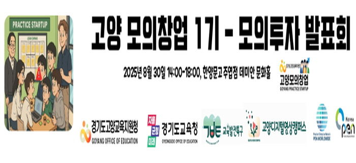 [한국기자연대] 경기도고양교육지원청은 오는 8월 30일 오후 2시, 한양문고 주엽점 데미안문화홀에서 '교육발전특구 디지털영상캠퍼스 모의창업프로그램(1기) 모의투자대회'를 개최한다. 이번 대회는 지난 9주 동안 창업의 전 과정을 경험한 고양시 중·고등학생 11개 팀이 직접 투자자 앞에서 아이디어를 발표하고, 가상 투자유치를 모의 체험하는 자리다.