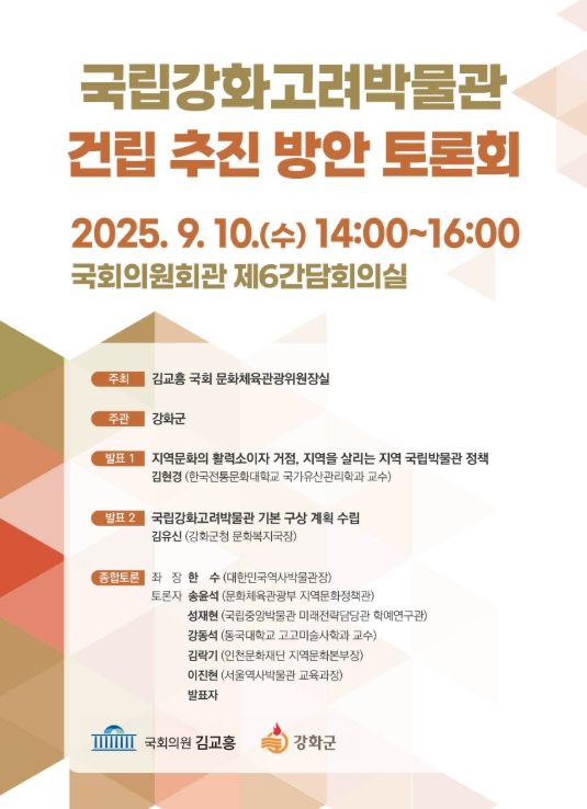[한국기자연대] 강화군은 김교흥 국회의원실에서 주최하고, 강화군이 주관하는 '국립강화고려박물관 건립 추진 방안 토론회'가 오는 9월 10일 국회의원회관 제6간담회실에서 열린다고 밝혔다.