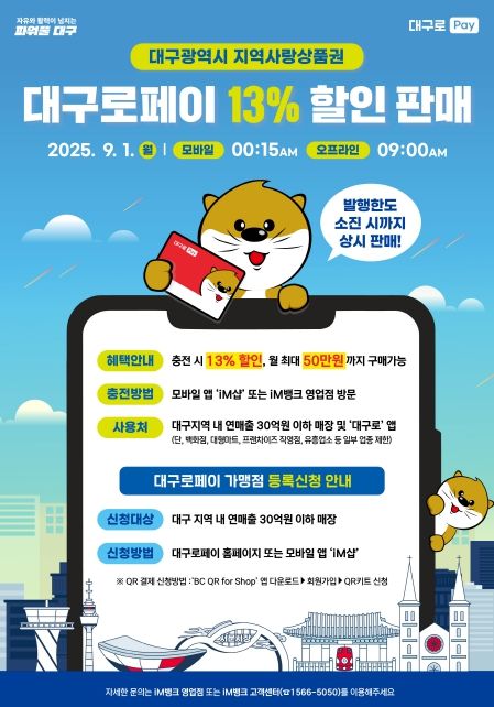 [한국기자연대] 대구광역시는 오는 9월 1일부터 대구사랑상품권 ‘대구로페이’의 할인율을 기존 7%에서 13%로 대폭 상향해 발행한다.