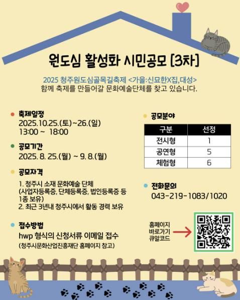 이번 공모는 10월 25일부터 26일까지 상당구 대성로 122번길 일원에서 열리는 청주원도심골목길축제 ‘가을:신묘한×집,대성’과 연계된다.