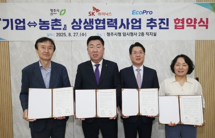[한국기자연대] 청주시는 27일 지역 기업인 SK하이닉스㈜, ㈜에코프로와 기업과 농촌 간 상생협력 발전을 위한 업무협약을 체결했다.