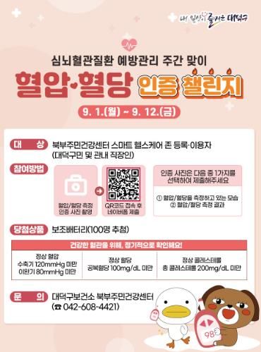[한국기자연대] 대전 대덕구가 심뇌혈관질환 예방관리주간(9월 1~7일)을 맞아, 오는 9월 1~12일 ‘혈압·혈당 인증 챌린지’를 운영한다고 28일 밝혔다.