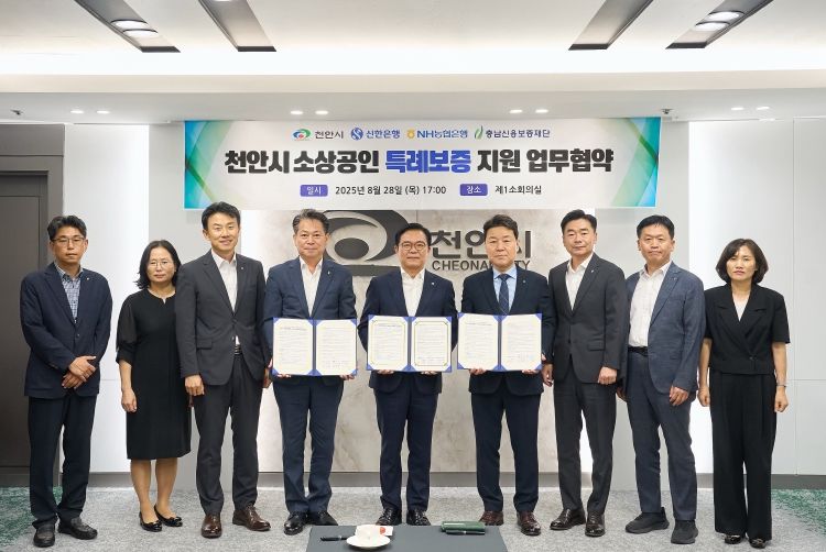 [한국기자연대] 천안시는 28일 농협은행, 신한은행, 충남신용보증재단과 함께 ‘2025년 소상공인 특례보증 업무협약’을 체결했다.