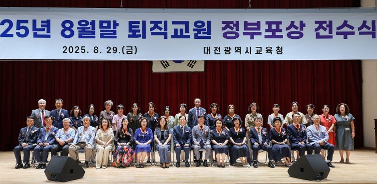 [한국기자연대] 대전시교육청은 8월 29일 11시 본관 대강당에서 퇴직교원 정부포상 대상자와 가족 및 교육청 관계자 등이 참석한 가운데 2025년 8월말 퇴직교원 정부포상 전수식을 개최했다고 밝혔다.