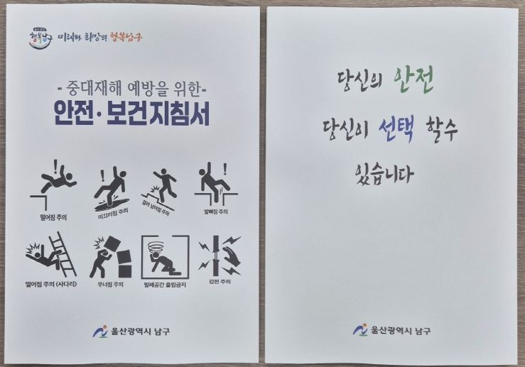 남구에 따르면 이번 지침서는 남구청의 업무 특성과 현장 여건을 반영한 실무 중심의 기준서로 직원들의 안전의식을 높이고 조직 전반의 예방 중심 안전문화를 정착시키기 위해 각종 장비 사용에서의 안전수칙과 비상대응 매뉴얼 등을 담아 울산 5개 구군 중 최초로 제작했다.