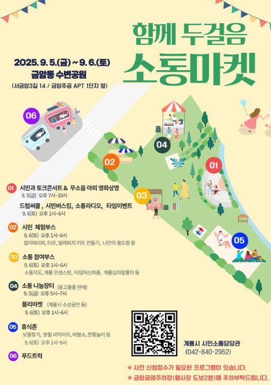 [한국기자연대] 계룡시는 오는 5일부터 6일까지 금암동 수변공원에서 시민과 함께 만드는'함께 두 걸음, 소통마켓'행사를 개최한다고 밝혔다.