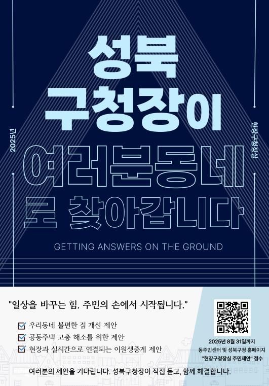 [한국기자연대] 서울 성북구가 오는 9월 16일부터 11월 11일까지 총 20개 동에서 『2025년 하반기 1일 현장구청장실』을 운영한다고 밝혔다.