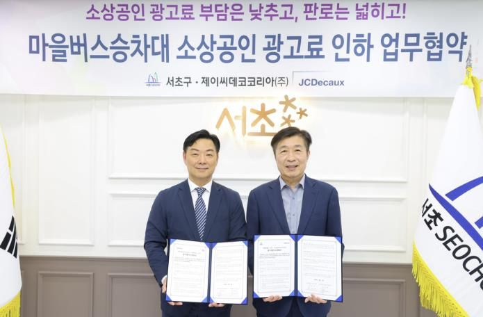 구는 지난 2일 글로벌 옥외광고 기업 제이씨데코코리아(주) 김주용 대표이사와 업무협약(MOU)을 체결하고, 지역 내 마을버스 승차대 7곳에 설치된 14기의 디지털 광고판을 소상공인이 저렴하게 이용할 수 있도록 했다.