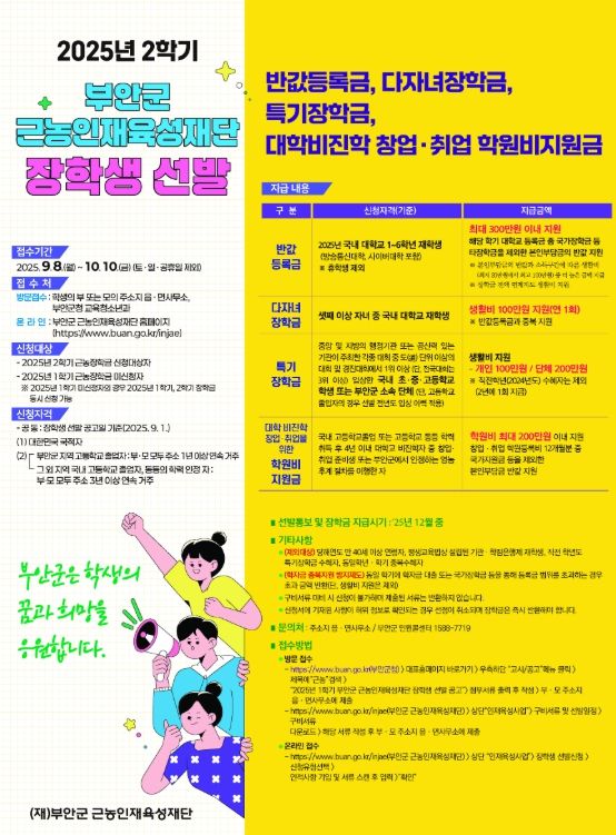 [한국기자연대] 부안군 근농인재육성재단은 2025년 2학기 장학생 신청 접수를 위해 각종 홍보자료를 준비하고 온라인 접수 시스템을 정비하는 등 장학금 지급 준비를 모두 마쳤다고 밝혔다.