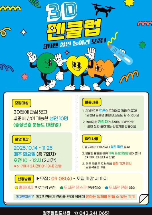 [한국기자연대] 청주열린도서관은 10월 14일부터 11월 25일까지 매주 화요일에 성인 및 중장년층 10명을 대상으로 3D펜 동아리 ‘펜클럽’을 두 달간 운영한다.