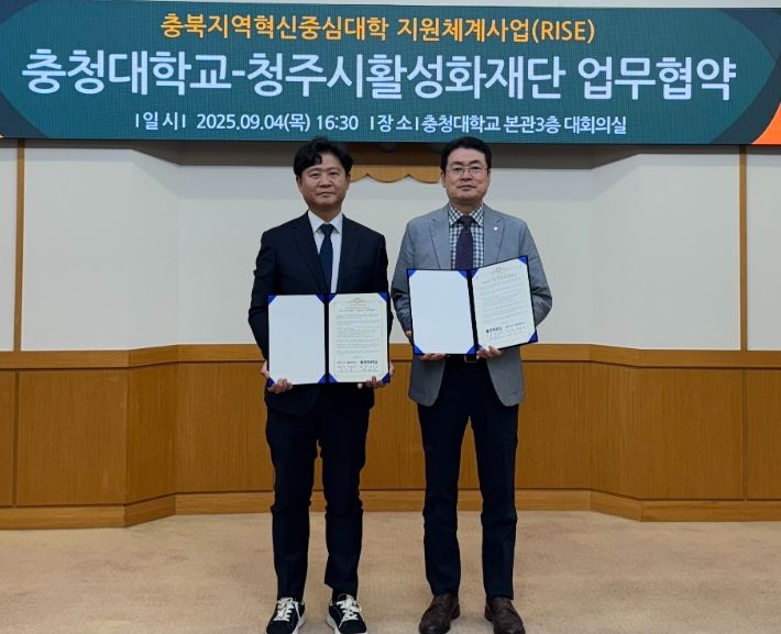 [한국기자연대] (재)청주시활성화재단과 충청대학교는 9월 4일 충청대학교에서 업무협약(MOU)을 체결했다. 협약식에는 황종대 청주시활성화재단 대표이사와 송승우 충청대학교 총장이 참석했다.