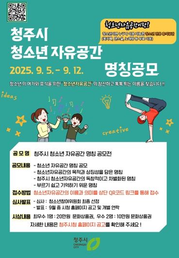 시 관계자는 “당선 명칭은 향후 청주시 전역에 확대 조성되는 모든 청소년자유공간의 공식 명칭으로 사용될 예정”이라며 “청주시를 대표하는 새로운 청소년 이용시설의 명칭 공모에 시민 여러분의 창의적이고 참신한 명칭 제안을 기다린다”고 밝혔다.