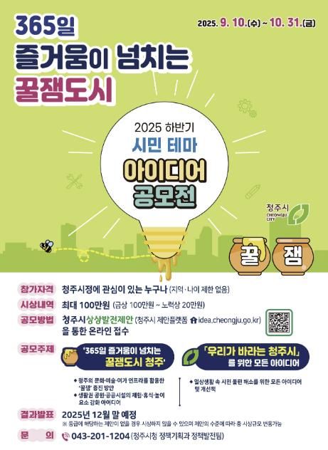 시 관계자는 “이미 각 분야에서 시민들의 아이디어가 청주시민의 일상에 활력을 더하고 있다”며 “이번 공모전을 통해 더 많은 시민이 참여해 더욱 즐거운 청주시로 함께 성장할 수 있기를 기대한다”고 말했다.