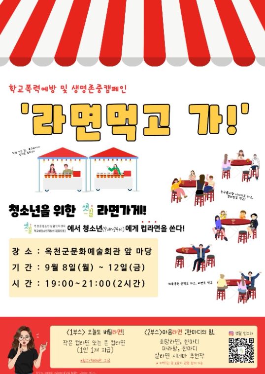 [한국기자연대] 옥천군청소년상담복지센터와 옥천군학교밖청소년지원센터는 청소년의 건강한 성장을 지원하기 위해 ‘생명존중 및 학교폭력예방 캠페인 '라면 먹고 가'’를 9월 8일부터 12일까지 매일 저녁 7시부터 9시에 옥천군문화예술회관 앞마당에서 개최한다.
