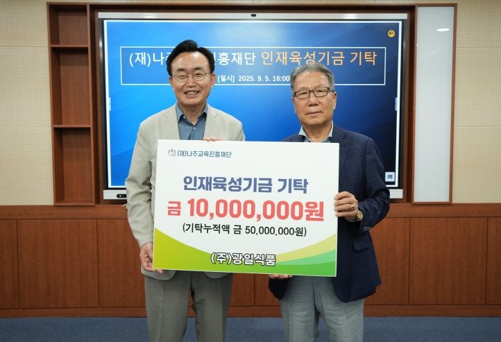 나주시(시장 윤병태)는 ㈜광일식품(대표 조문호)이 인재육성기금 1천만 원을 (재)나주교육진흥재단에 기부하며 2021년부터 지금까지 총 5천만 원의 장학금을 기탁했다고 8일 밝혔다.
