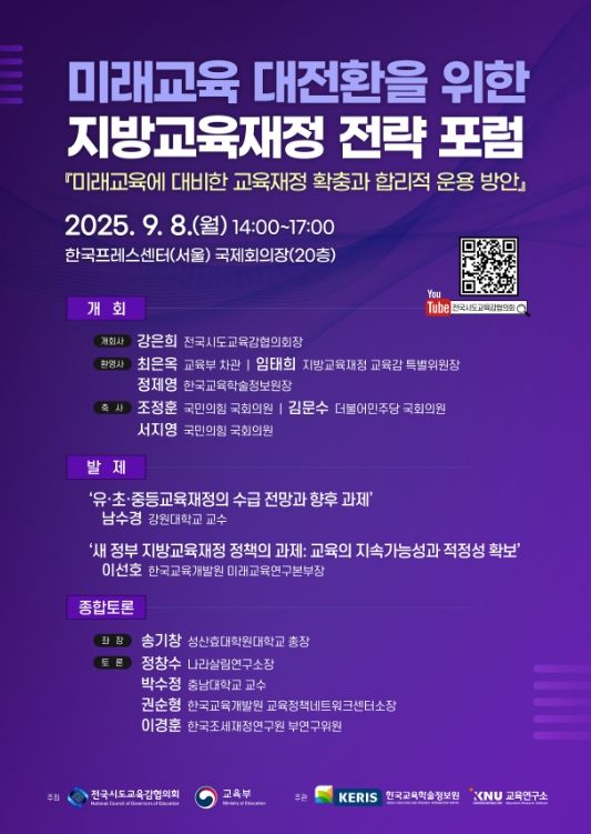이어 “지방교육재정의 안정적 확보는 선택이 아닌 국가의 책임이자 아이들의 권리”라며 “오늘 포럼이 단순한 토론을 넘어 교육재정 안정화를 위한 국가적 의지를 확립하는 출발점이 되기를 바란다”라고 말했다.