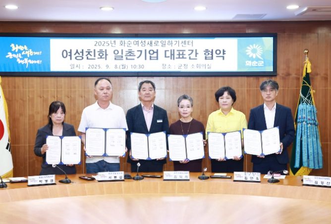 [한국기자연대] 화순군은 8일 군청 소회의실에서 화순여성새로일하기센터와 관내 5개 기업 대표 및 임직원이 참석한 가운데 2025년 여성친화 일촌기업 협약식을 체결했다고 밝혔다.