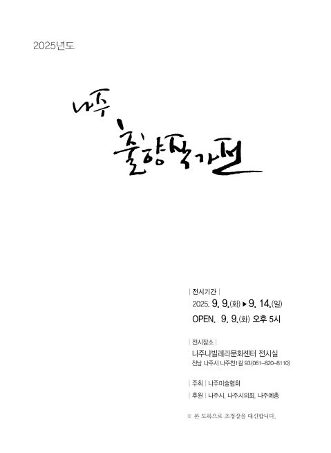 [한국기자연대] 전라남도 나주시가 지역 문화예술 발전과 작가들의 교류를 위해 마련한 ‘2025 출향작가초대전’이 9일부터 14일까지 6일간 나주나빌레라문화센터 전시실에서 열린다.